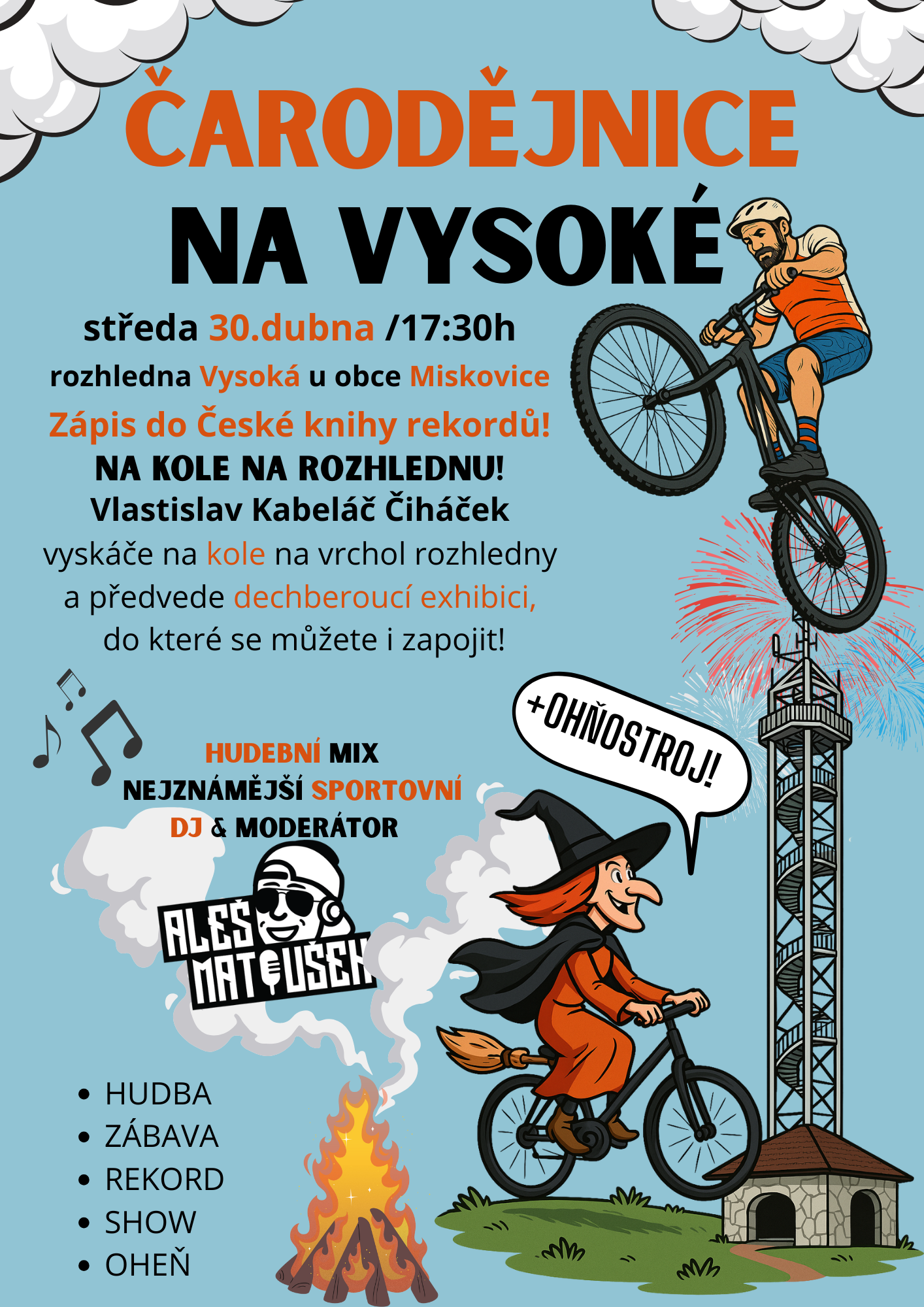 Přijďte si s námi užít ČARODĚJNICE NA VYSOKÉ Od 17.30 hod je připraven program pro děti, trial show, pokusíme se o zápis do České knihy rekordů, hudební mix Aleše Matouška, ohňostroj. Občerstvení po celou dobu akce zajištěno.