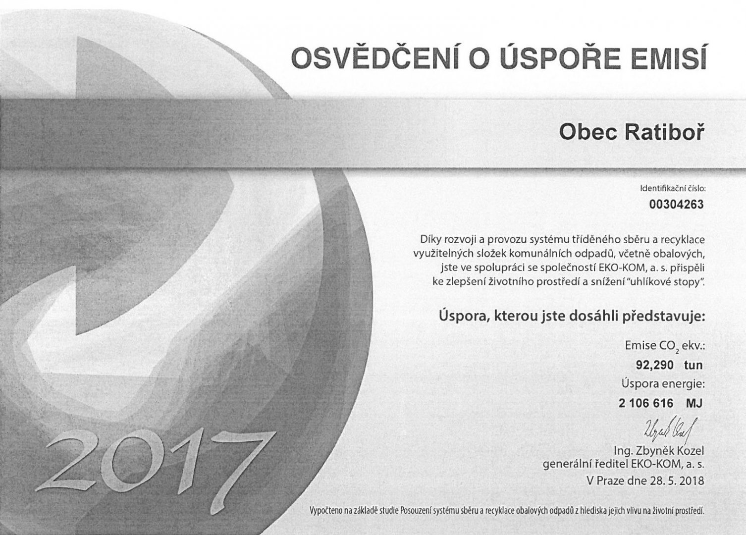 Díky rozvoji a provozu systému tříděného sběru a recyklace využitelných složek komunálních odpadů, včetně obalových, jste ve spolupráci se společností EKO-KOM, a. s. přispěli ke zlepšení životního prostředí a snížení „uhlíkové stopy“.