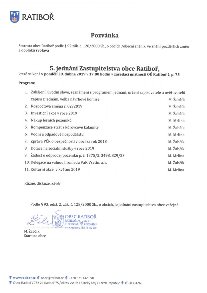 se konalo 29. dubna 2019 v zasedací místnosti OÚ Ratiboř