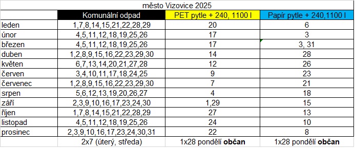 Svoz komunálních odpadů pro město Vizovice zajišťuje společnost Marius Pedersen, a.s. Termíny svozů jednotlivých komodit, tedy komunálního odpadu, plastů, tetrapaku a papíru od rodinných domů najdete níže v tabulce. Veškeré svozy začínají v 6 hodin.